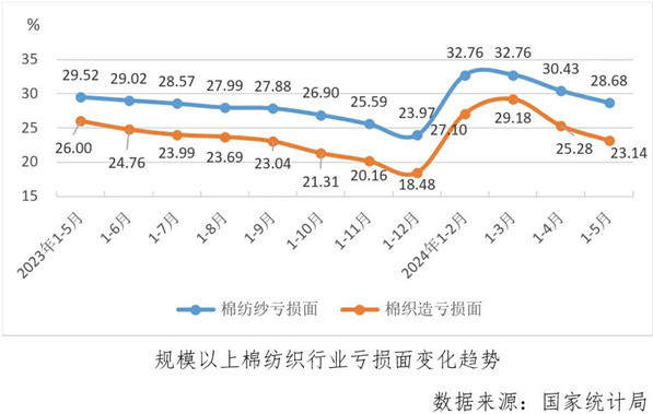 1-5月份,棉紡紗和棉織造的虧損面分別為28.68%和23.14%,在利潤率回升的帶動下,分別比1-4月份收窄1.75和2.14個百分點。