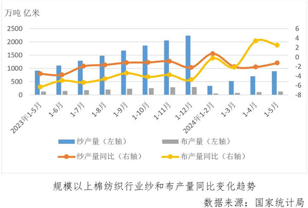 據(jù)國家統(tǒng)計局數(shù)據(jù),1-5月份,規(guī)上紗產(chǎn)量為891.8萬噸,同比下降1.28%,降幅比1-4月份收窄0.83個百分點,規(guī)上布產(chǎn)量為129.9億米,同比增長2.48%,較1-4月份增幅收窄0.91個百分點。