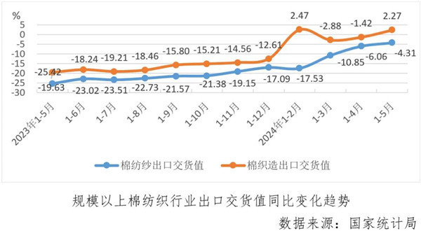 據(jù)國家統(tǒng)計局數(shù)據(jù),1-5月份,規(guī)上棉紡紗出口交貨值(以人民幣計)下降4.31%,與全國紡織品服裝出口增速正向增長相背離,但是較1-4月份降幅收窄1.75個百分點。規(guī)上棉織造出口交貨值(以人民幣計)同比增長2.27%,增幅弱于全國紡織品服裝,但與1-4月份相比,增速由負轉正。棉紡紗和棉織造出口數(shù)據(jù)呈現(xiàn)邊際逐步改善的積極信號。