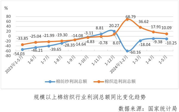 據(jù)國家統(tǒng)計局數(shù)據(jù),1-5月份,規(guī)上棉紡紗利潤同比下降10.25%,比1-4月份降幅擴大0.87個百分點,棉織造利潤同比增長10.09%,比1-4月份增速放緩7.82個百分點,棉紡紗和棉織造利潤同比增速持續(xù)分化。