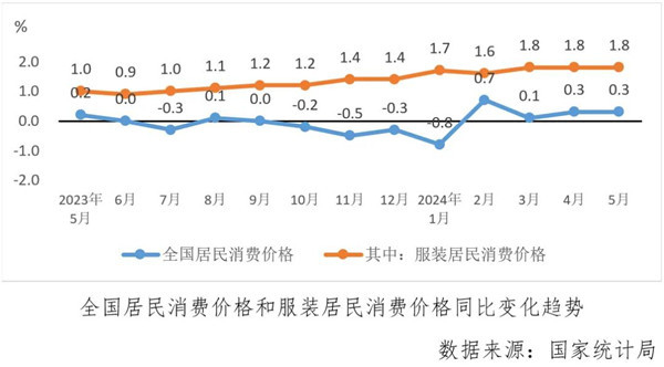 5月份,全國居民消費價格同比上漲0.3%,環(huán)比下降0.1%,其中服裝居民消費價格同比上漲1.8%,環(huán)比上漲0.4%。1-5月平均,全國居民消費價格比上年同期上漲0.1%,其中服裝居民消費價格同比上漲1.7%。