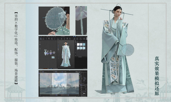 《天青呈露》運(yùn)用的AIGC和STYLE 3D技術(shù),對應(yīng)解決的正是文化素材設(shè)計和高效能打版問題。“在制作上,我們借助AIGC對過去圖樣進(jìn)行捕捉和輸入,通過輸入《聽琴圖》《十八學(xué)士圖》等宋畫的相關(guān)元素,根據(jù)設(shè)計指令生成古今融合的圖形紋樣?!币﹁〗忉專髽I(yè)從AIGC生成數(shù)字紋樣素材后,STYLE 3D則進(jìn)行數(shù)字仿真面料和數(shù)字打版,并生成數(shù)字樣衣,用戶可直觀查看紋樣、工藝、面料及款式細(xì)節(jié),而設(shè)計師也可第一時間根據(jù)需要,在電腦端直接對上述各項進(jìn)行優(yōu)化調(diào)整,大大提升了效率和效能。