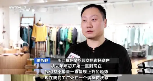在浙江杭州一家桑蠶絲面料銷售門店,電商主播張睿航表示,現(xiàn)在桑蠶絲面料很受歡迎,直播間一天的銷售額就能達(dá)到四萬元。