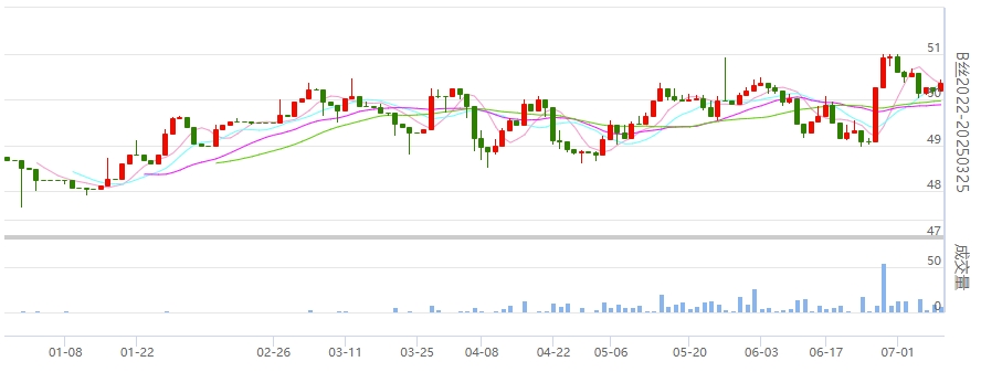 今日(2024年07月09日,周二)中國(guó)繭絲綢交易市場(chǎng)生絲電子指數(shù)上漲0.14%報(bào)5015.07點(diǎn)。B絲2022D(商檢4A級(jí)生絲):240725合約上漲0.06萬(wàn)元報(bào)收于50.13萬(wàn)元;240925合約上漲0.21萬(wàn)元報(bào)收于50.37萬(wàn)元;250325合約上漲0.18萬(wàn)元報(bào)收于50.37萬(wàn)元。B絲40/44-240725合約報(bào)平收于48.42萬(wàn)元;A絲20/22-240725合約報(bào)平收于51.84萬(wàn)元。(更多行情詳情到首頁(yè)進(jìn)行查看)