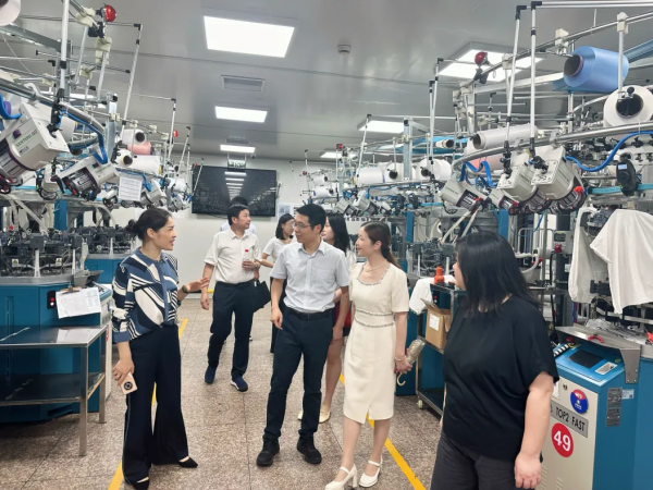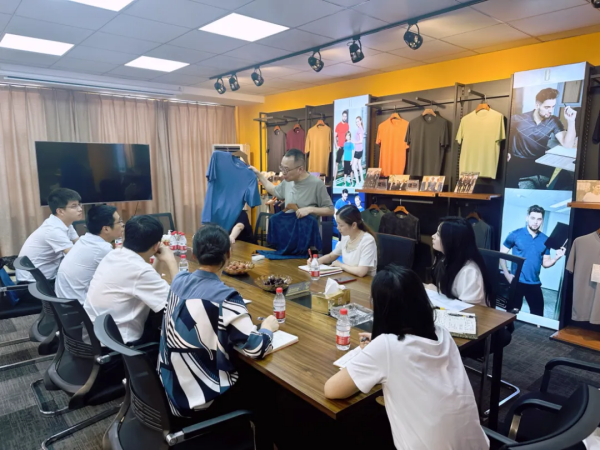 座談會(huì)上,駱總向高處介紹了凱喜雅集團(tuán)的全產(chǎn)業(yè)鏈布局、全球化布局。凱喜雅集團(tuán)從一片桑葉,一顆蠶繭做起,擁有種桑養(yǎng)蠶、繅絲織造、印染及后整理、服裝服飾品制造加工和自有品牌建設(shè)等完整生產(chǎn)體系,并在近幾年布局東南亞,積極主動(dòng)應(yīng)對(duì)外貿(mào)環(huán)境變化,堅(jiān)定落實(shí)全球化布局。高處對(duì)集團(tuán)的戰(zhàn)略表示認(rèn)同,近年越來越多的企業(yè)開始著眼于海外布局,凱喜雅集團(tuán)走在前列,是順應(yīng)環(huán)境趨勢(shì)的正確選擇??萍际堑谝簧a(chǎn)力,駱總向高處一行著重介紹了集團(tuán)的研發(fā)投入、設(shè)備投入以及成果轉(zhuǎn)化回報(bào)。展館中的40針工藝成衣,自有專利紗線制成的速干衣引來眾人贊不絕口。會(huì)議室內(nèi)氣氛熱烈,駱總用板書概述了華蒙系的生產(chǎn)計(jì)劃,他強(qiáng)調(diào)要與客戶制定長期合作計(jì)劃,建立長期合作,以求穩(wěn)定的客戶、穩(wěn)定的訂單和穩(wěn)定的交貨。綜合考慮商品生命力、設(shè)備及研發(fā)投入回報(bào)周期,提前布局,才能不斷推陳出新,實(shí)現(xiàn)差異化競(jìng)爭(zhēng),在日趨內(nèi)卷的紡織行業(yè)保持穩(wěn)定的發(fā)展節(jié)奏。