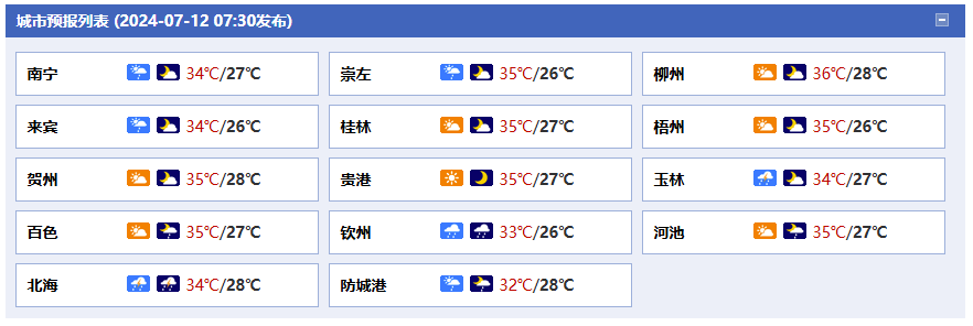 7月12-14日,廣西火辣辣的艷陽天霸屏,今天白天河池、百色、北海、欽州等市的部分地區(qū)有小到中雨,其它地方偶爾有零零散散的陣雨雷雨來刷存在感,公眾外出最好準(zhǔn)備一把晴雨傘,遮陽擋雨雙管齊下。