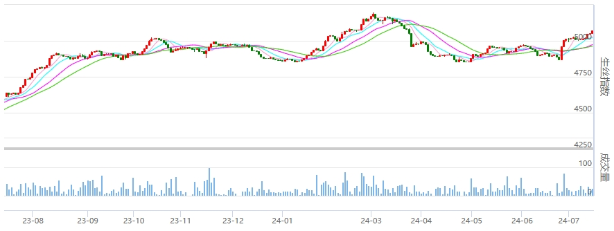今日(2024年07月15日,周一)中國(guó)繭絲綢交易市場(chǎng)生絲電子指數(shù)上漲0.35%報(bào)5072.62點(diǎn)。B絲2022D(商檢4A級(jí)生絲):240725合約上漲0.18萬(wàn)元報(bào)收于51.03萬(wàn)元;240925合約上漲0.36萬(wàn)元報(bào)收于51.06萬(wàn)元;250325合約上漲0.21萬(wàn)元報(bào)收于50.94萬(wàn)元。B絲40/44-240725合約報(bào)平收于48.42萬(wàn)元;A絲20/22-240725合約報(bào)平收于51.90萬(wàn)元。(更多行情詳情到首頁(yè)進(jìn)行查看)