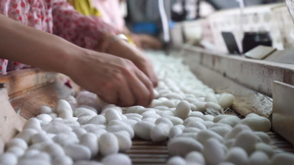 為了保障蠶絲生產(chǎn)質量,收購回來的蠶繭需要立馬進行烘干處理。烘干完成的蠶繭需要經(jīng)過精挑細選,剔除殘次繭后,才能被運往加工車間進行加工。在云南錦冠絲綢有限公司繅絲加工車間內,自動化機械設備不停運轉。一顆顆質量上乘的蠶繭在經(jīng)過煮繭、繅絲、浸絲、復搖、編絲、整理、檢驗、打包等流程后,才能變成了成品絲線。每個環(huán)節(jié)嚴格把關,生產(chǎn)出來的優(yōu)質絲線才能走向市場。