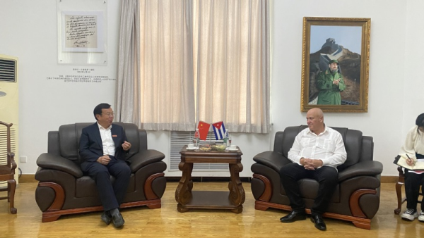 7月15日,來華出席全球共享發(fā)展行動論壇第二屆高級別會議的古巴副總理塔皮亞在古巴駐華大使館會見江蘇科技大學黨委書記周南平。