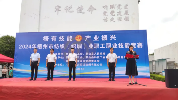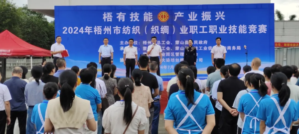 7月19日,由廣西梧州市總工會、蒙山縣人民政府主辦,蒙山縣總工會、蒙山縣科技工業(yè)信息化和商務局、蒙山縣工業(yè)園區(qū)管理委員會共同承辦以“梧有技能·產(chǎn)業(yè)振興”為主題的2024年梧州市紡織(織綢)業(yè)職工職業(yè)技能競賽在廣西蒙山大染坊絲綢有限公司拉開帷幕。梧州市總工會黨組成員、副主席楊振中出席開幕式并宣布技能競賽開幕。蒙山縣人民政府副縣長梁潔銘在競賽開幕式上致辭。