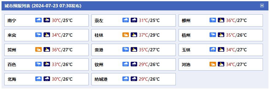 24日白天到晚上,桂西南及沿海部分地區(qū)有小到中雨、局地大雨到暴雨,其它地區(qū)多云有陣雨或雷雨、局地大雨。