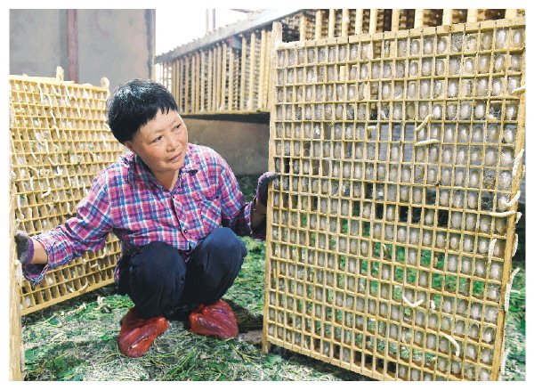 蠶農(nóng)在查看蠶蟲爬上蠶蔟結繭