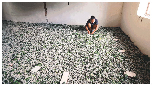走進蠶農(nóng)黃詩全的蠶房中,地上一片銀白色全是蠶蟲。黃詩全介紹,蠶生長快,20天就能結繭,一年最多可養(yǎng)10批,一張蠶能結出約100公斤的蠶繭。他今年養(yǎng)了4張蠶,這是他養(yǎng)的第5批。去年蠶繭價格每公斤50元左右,今年春季最高時候每公斤賣到了64元。