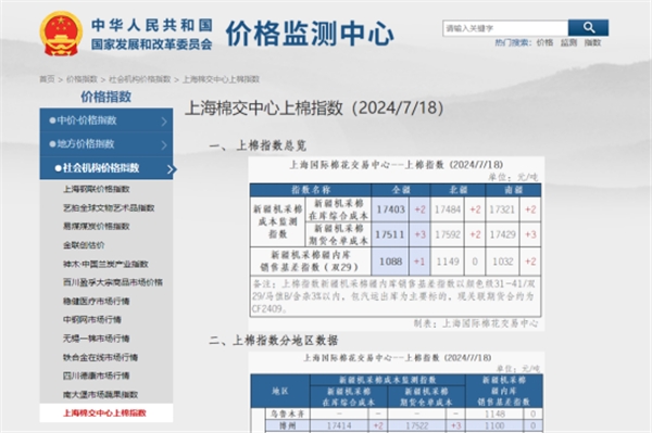 7月18日,在國家發(fā)展和改革委員會價格監(jiān)測中心網(wǎng)站 “價格指數(shù)”--“社會機構價格指數(shù)”板塊中,首次發(fā)布了上海棉交中心上棉指數(shù)。該指數(shù)多維度反映國內棉花市場價格變化,將為國內涉棉產業(yè)鏈相關企業(yè)生產經(jīng)營提供價格參考與決策支持。