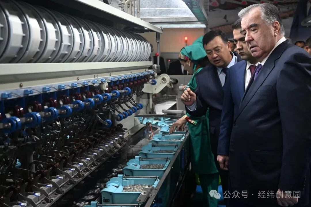 △塔吉克斯坦總統(tǒng)埃莫馬利·拉赫蒙觀看自動繅絲機生產(chǎn)情況