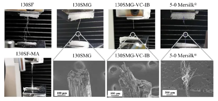 圖3結(jié)果顯示,130SF和130SF-MA截面松散,說明內(nèi)部纖維是一根一根斷裂。130MG和130MG-VC-IB緊密結(jié)合,區(qū)域內(nèi)所有纖維均勻分擔(dān)斷裂力,使斷裂截面整齊均勻,斷裂強(qiáng)力更大。5-0蠶絲編織線,內(nèi)部纖維應(yīng)力相似,斷裂截面整齊均勻,但縫線輪廓內(nèi)部是松散的。