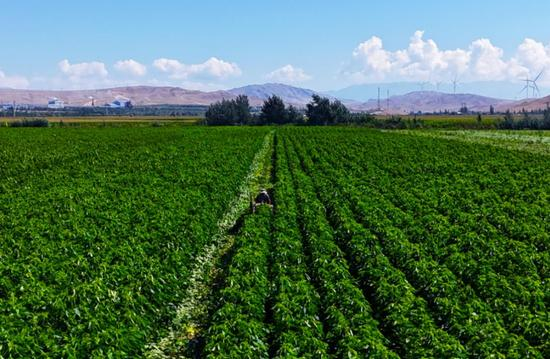 8月4日,在伊寧縣溫亞爾鎮(zhèn)布力開村,今年4月底從南通引進(jìn)栽植的330畝、190萬株蛋白桑苗葉片肥厚、色澤翠綠,工人們正在搶抓時(shí)間收割,田間呈現(xiàn)出一片豐收的景象。這些桑蠶葉晾曬、分揀之后將添加微量元素,制作成蠶寶寶的營養(yǎng)飼料。