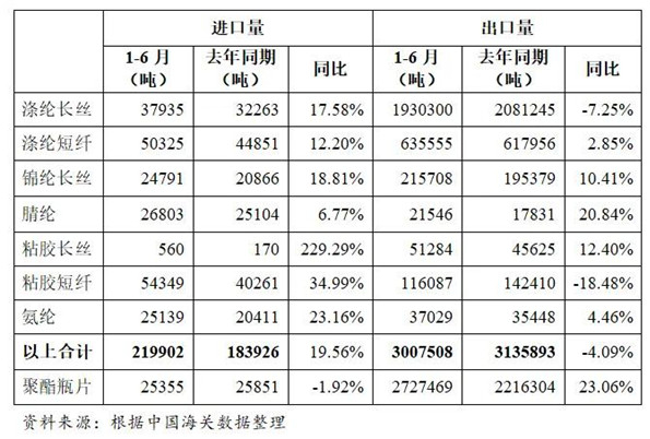 表2 2024年1-6月化纖主要產(chǎn)品進(jìn)出口情況