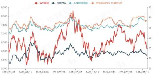 注:WTI期貨(右軸,美元/桶),PTA、滌綸POY和滌短(左軸,元/噸)