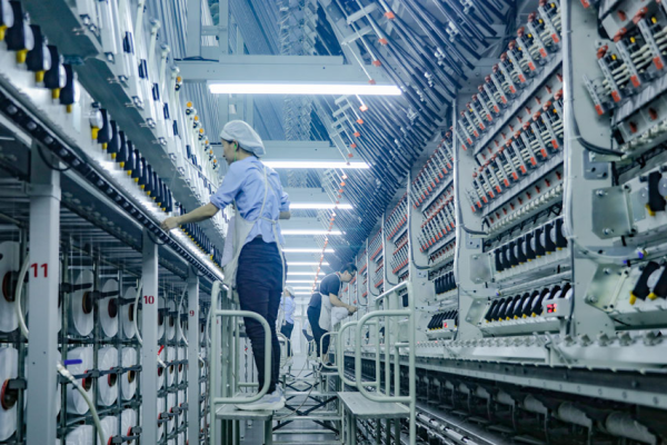 四川美華新材料有限公司內(nèi),各生產(chǎn)線忙碌運(yùn)轉(zhuǎn),后紡智慧車間大屏閃爍,產(chǎn)量、能耗、質(zhì)檢等數(shù)據(jù)一目了然。原材料經(jīng)過牽伸、加彈、卷繞,錦綸紡絲如瀑布般傾瀉而下。
