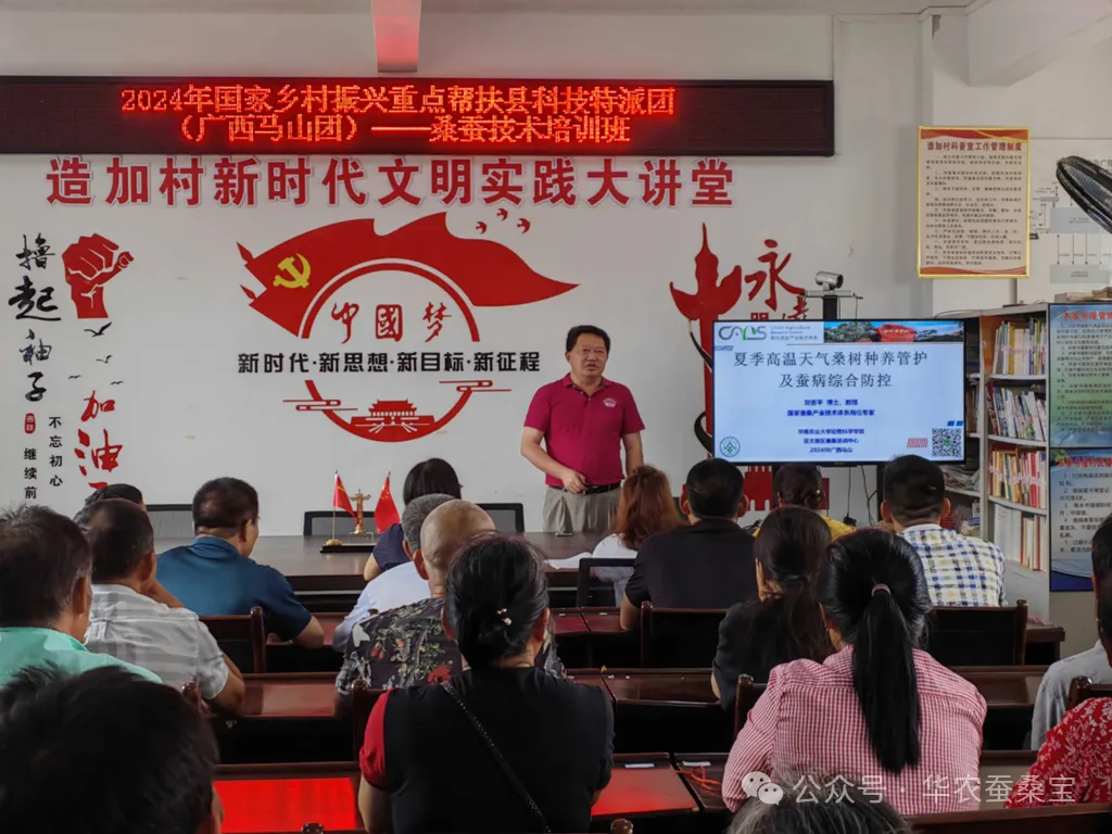 緊接著,劉吉平教授前往馬山縣永州鎮(zhèn)造加村,為村民們帶來(lái)了一場(chǎng)以“應(yīng)對(duì)夏季高溫,桑樹(shù)種養(yǎng)精細(xì)管理及蠶病全面預(yù)防”為主題的專(zhuān)業(yè)技術(shù)培訓(xùn)講座。在講座過(guò)程中,劉教授系統(tǒng)闡述了桑樹(shù)栽培護(hù)理的要點(diǎn)、桑樹(shù)病蟲(chóng)害的有效防控策略以及蠶病預(yù)防的綜合措施,使與會(huì)者受益匪淺。