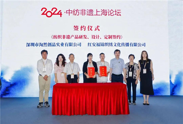 為助力紡織非遺產(chǎn)業(yè)化與市場(chǎng)化進(jìn)程,推動(dòng)紡織非遺與現(xiàn)代設(shè)計(jì)、時(shí)尚產(chǎn)業(yè)、文化旅游等的跨界融合,論壇上,兩位中國(guó)紡織非遺新青年率先做出響應(yīng),深圳淘然創(chuàng)品實(shí)業(yè)有限公司創(chuàng)始人劉艷,紅安福錦織繡文化傳播有限公司總經(jīng)理陶文成就紅安大布的紡織非遺產(chǎn)品設(shè)計(jì)、研發(fā)、定制簽訂合作協(xié)議。
