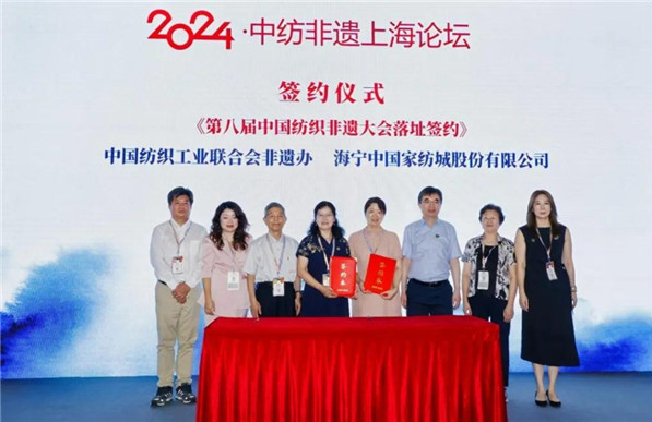為弘揚(yáng)中華優(yōu)秀傳統(tǒng)文化,推動(dòng)紡織非遺新質(zhì)生產(chǎn)力發(fā)展,深度挖掘紡織非遺文化價(jià)值,展現(xiàn)其在當(dāng)代社會(huì)的創(chuàng)新活力和市場(chǎng)潛力,8月14日,2024intertextile秋冬家紡展開幕首日,以“紡織非遺一產(chǎn)業(yè)化與市場(chǎng)化中破局前行”為主題的“2024·中紡非遺上海論壇”同期召開。論壇上,還進(jìn)行了兩組落地合作簽約。