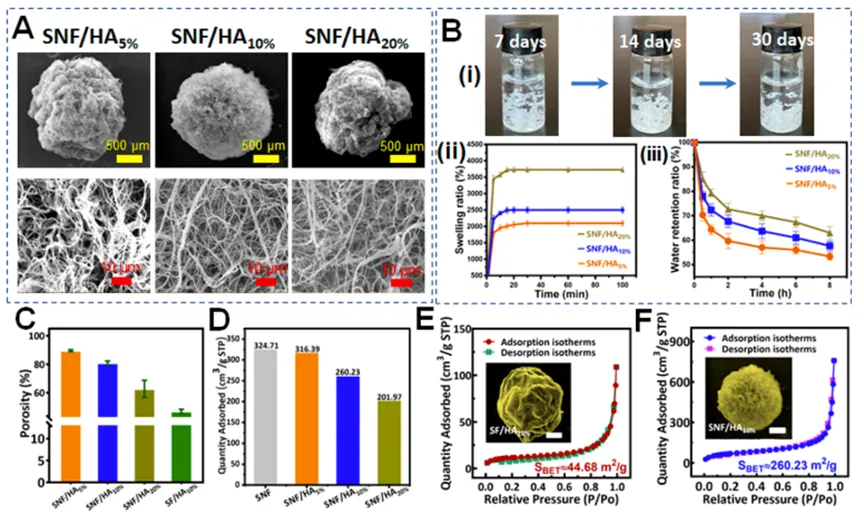 微球在水中表現(xiàn)出很高的穩(wěn)定性,即使在PBS中浸泡30天后也是如此。微球的膨脹率和保水率隨著HA含量的增加而增加,這歸因于HA的超親水性。透明質(zhì)酸的引入大大提高了SNF微球的親水性和水結(jié)合能力,有利于微球作為細(xì)胞載體和支架。相反,隨著HA含量的增加,孔隙率和比表面積顯著降低,因?yàn)镠A占據(jù)了納米纖維之間的空間。綜上所述,含10% HA的微球?yàn)樽鳛楹罄m(xù)實(shí)驗(yàn)的優(yōu)化組。SNF/HA10%微球的比面積比SF/HA10%微球增加了5倍以上,表明SNF/HA10%微球在用作細(xì)胞載體或組織工程支架時具有潛在的高吸附性和負(fù)載能力。