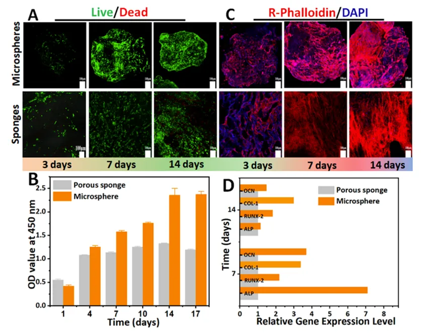 研究了骨髓間充質(zhì)干細(xì)胞(BMSCs)在SNF微球上的增殖情況,并將其與含10% HA的再生SF海綿進(jìn)行了比較。微球和多孔海綿均支持干細(xì)胞的長期生長和持續(xù)增殖。有趣的是,SNF微球上的細(xì)胞活力值高于多孔海綿,表明SNF微球具有更好的細(xì)胞相容性。進(jìn)一步,在微球上評估骨髓間充質(zhì)干細(xì)胞的成骨分化行為。SNF微球和多孔海綿均能支持成骨分化誘導(dǎo)下的細(xì)胞生長骨特異性標(biāo)記物的表達(dá),成骨標(biāo)志物ALP、Runx2.Col和OCN這些基因在第7天SNF微球上的表達(dá)水平高于多孔海綿,表明SNF微球?qū)Τ晒欠只恼T導(dǎo)作用增強(qiáng)。