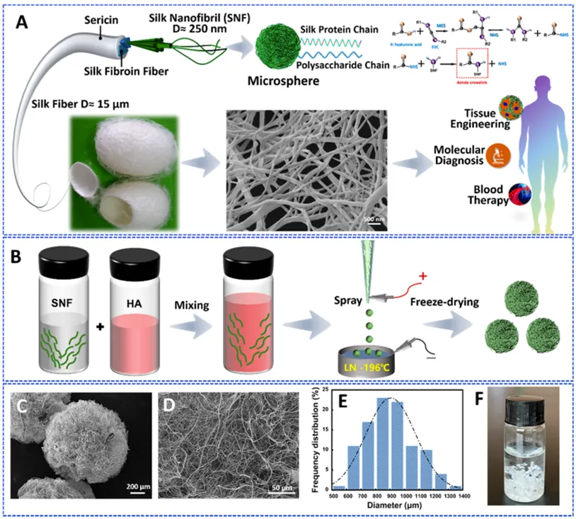 Yan S, Wang L, Fan H, et al. Biomimetic Natural Silk Nanofibrous Microspheres for Multifunctional Biomedical Applications. ACS Nano.2022;16(9):15115—15123.doi:10.1021/acsnano.2c06331