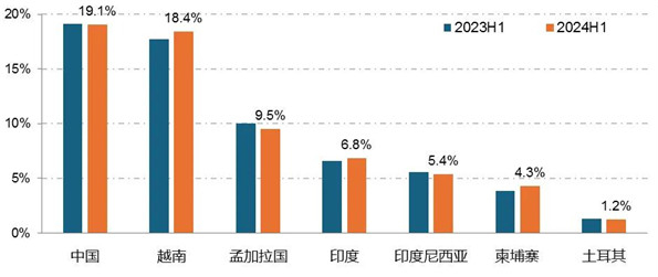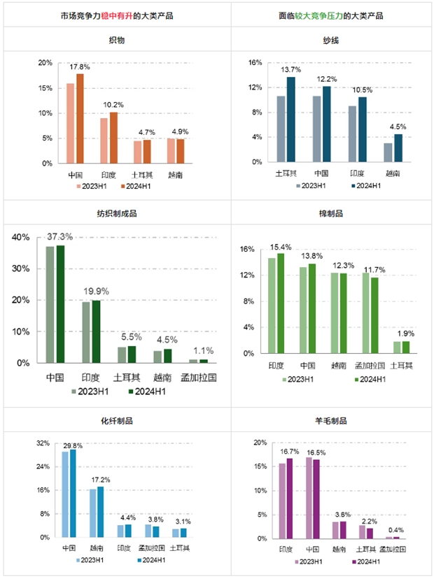 今年以來,我國(guó)紡織行業(yè)面臨的外部形勢(shì)較為復(fù)雜,海外市場(chǎng)需求疲弱、國(guó)際貿(mào)易摩擦加劇等風(fēng)險(xiǎn)因素帶動(dòng)行業(yè)國(guó)際貿(mào)易環(huán)境不穩(wěn)定不確定因素明顯增多。但受益于行業(yè)自身體系完備、高效協(xié)同的產(chǎn)業(yè)優(yōu)勢(shì)及全球領(lǐng)先的制造優(yōu)勢(shì),行業(yè)國(guó)際市場(chǎng)競(jìng)爭(zhēng)力持續(xù)釋放,上半年我國(guó)紡織品服裝在美國(guó)、歐盟進(jìn)口市場(chǎng)中所占份額小幅提升,在日本進(jìn)口市場(chǎng)中所占份額微降。
