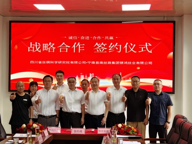 南絲路集團(tuán)銀鴻絲業(yè)有限公司是國際國內(nèi)最大6A級優(yōu)質(zhì)生絲生產(chǎn)基地,擁有35組自動繅絲機(jī)、年產(chǎn)1200噸高等級生絲生產(chǎn)規(guī)模,是我國高等級生絲生產(chǎn)的標(biāo)桿企業(yè)。2024年6月南絲路集團(tuán)銀鴻絲業(yè)有限公司與四川省絲綢科學(xué)研究院開展技術(shù)合作,以院企合作的方式進(jìn)行科技攻關(guān)、創(chuàng)新研究、成果轉(zhuǎn)化等技術(shù)服務(wù)工作。