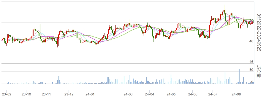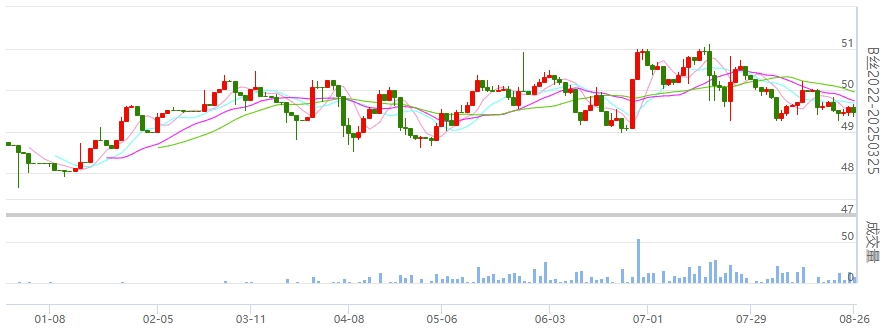今日(2024年08月26日,周一)中國繭絲綢交易市場生絲電子指數(shù)報收于4954.10點。B絲2022D(商檢4A級生絲):240925合約下跌0.03萬元報收于50.01萬元;250325合約下跌0.12萬元報收于49.47萬元。