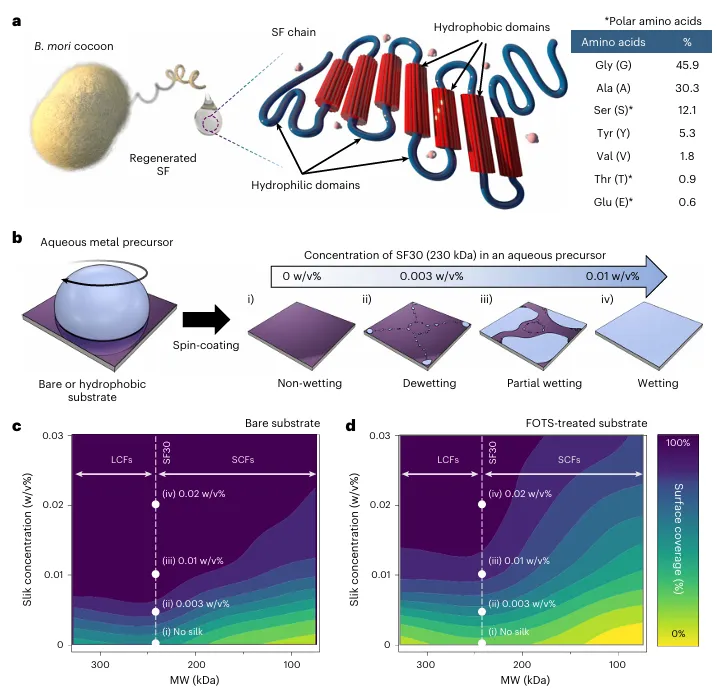 圖1 作為天然表面活性劑的 SF。b, 旋轉(zhuǎn)涂層金屬水合物提高表面覆蓋率的示意圖。金屬水合物溶液的表面覆蓋率的示意圖。c,d, 添加了 SF 的金屬水溶液的表面覆蓋率(%)。的表面覆蓋率(%)?;祝╟)和 基底上的表面覆蓋率(%)?;祝╠)上 SF 添加的金屬水溶液的表面覆蓋率(%)與濃度和分子量的函數(shù)關(guān)系。