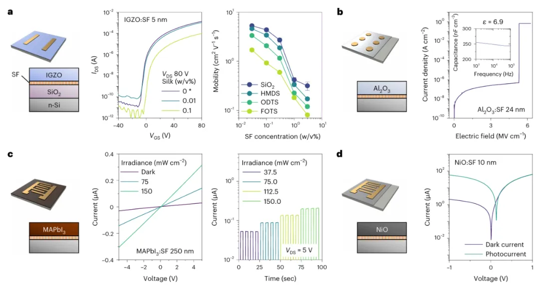 圖4 使用絲表面活性劑的水激活納米器件。基于IGZO:SF的場(chǎng)效應(yīng)晶體管(FET)。中間:用不同的晶體管的轉(zhuǎn)移曲線。右圖:不同 SF 晶體管的電荷遷移率。數(shù)據(jù)點(diǎn)和誤差條顯示平均值±s.d.(樣本數(shù)為 3)。以及制備的 MAPbI3 的薄膜的 I-V 特性。d, 基于 NiO:SF 的光電探測(cè)器的結(jié)構(gòu)(左)和在不同側(cè)向電壓(中)和時(shí)間(右)下的光探測(cè)器的結(jié)構(gòu)(左)及其在白光照明下的 I-V 特性(右)。(右圖)。所有器件都是在疏水性基底上制造的SF 基絕緣體的結(jié)構(gòu)(左)及其電流密度-電場(chǎng)曲線。