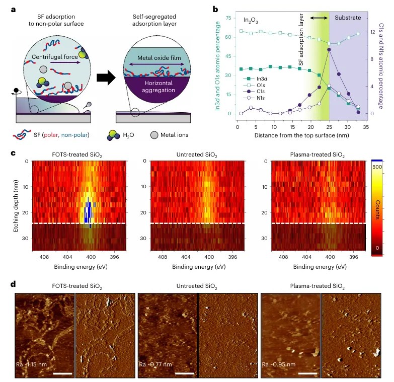 圖3 絲綢表面活性劑在薄膜-固體界面的自適應(yīng)吸附。a, 表面活性劑在涂覆過程中的自分離示意圖。b, XPS 深度剖面化學(xué)成分分析 厚度為 25 納米的 In2 O3薄膜的化學(xué)成分分析。數(shù)據(jù) c, N1s 在 In2O3薄膜中的 N1s 分布。SF 沉積在具有不同自由表面能的基底上的 In2 O3 薄膜中的 N1s 分布。白色虛線線表示與二氧化硅d,通過選擇性蝕刻金屬氧化物獲得的埋藏 SF 層的高度和偏轉(zhuǎn) AFM圖,通過選擇性蝕刻金屬氧化物獲得(比例尺,1 μm;Ra,平均值;Ra,算術(shù)平均粗糙度)。