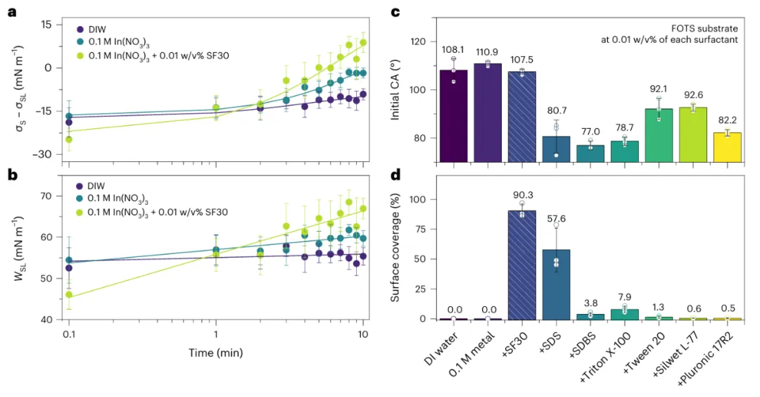 從熱力學(xué)角度來看,潤濕是液體在固體表面擴(kuò)展以最小化自由能的現(xiàn)象。液體在固體上的潤濕性可通過界面能和粘附功來評(píng)估,分別由楊氏方程和粘附功方程表示。本文評(píng)估了含絲素蛋白(SF)溶液在疏水性基底上的表面張力和接觸角(CA)變化,使用煮沸30分鐘的SF(SF30)。結(jié)果顯示,盡管SF30溶液的表面張力變化與對(duì)照組相似,但其接觸角顯著降低(補(bǔ)充圖2),表明潤濕增強(qiáng)主要通過改變液-固界面能實(shí)現(xiàn),而非降低溶液表面張力。圖2a顯示,SF摻雜溶液與固體表面之間的界面能顯著降低,圖2b顯示界面粘附力增加。與六種商用表面活性劑相比,盡管它們有效降低了溶液表面張力,但對(duì)界面能的控制不及SF(圖2c,d)。SF30在疏水性基底上的表面覆蓋率超過90%,且優(yōu)于分子量相近的合成表面活性劑(延伸數(shù)據(jù)圖1)。