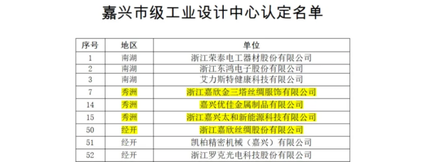 近日,嘉興市經(jīng)信局發(fā)布了2024年嘉興市級工業(yè)設(shè)計中心企業(yè)認(rèn)定名單,浙江嘉欣絲綢股份公司及旗下浙江嘉欣金三塔絲綢服飾有限公司、嘉興優(yōu)佳金屬制品有限公司和浙江嘉興太和新能源科技有限公司同時通過“嘉興市市級工業(yè)設(shè)計中心”認(rèn)定。