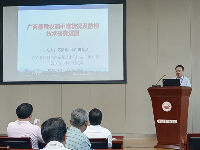 西南大學資源昆蟲高效養(yǎng)殖與利用全國重點實驗室副主任李田研究員,安徽農(nóng)業(yè)大學生命科學學院資源昆蟲生物學與創(chuàng)新利用安徽省重點實驗室主任徐家萍研究員、華南農(nóng)業(yè)大學劉吉平教授、江蘇科技大學吳萍研究員、浙江大學邵勇奇教授等20多位專家學者就蠶病理學及病蟲害防控領(lǐng)域的基礎理論、應用研究、技術(shù)推廣等多個方面研究成果做了精彩報告。其中,廣西蠶業(yè)技術(shù)推廣站科技人員在大會上分別作《廣西桑蠶農(nóng)藥中毒狀況及防控技術(shù)研究進展》、《廣西蠶區(qū)家蠶中腸型膿病發(fā)生狀況及其病原種類特征研究》、《高效氯氟氰菊酯引起桑蠶農(nóng)藥中毒的溯源研究》專題報告。