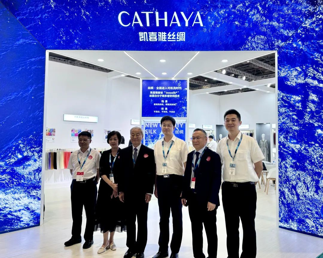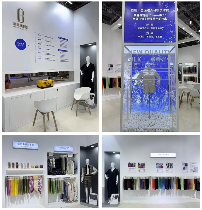 2024 intertextile秋冬面輔料展主推產(chǎn)品2024年,凱喜雅集團(tuán)實(shí)現(xiàn)Innosilk?可機(jī)洗真絲技術(shù)的全色系、全類目、全場景、全規(guī)格應(yīng)用,全域升級(jí),推動(dòng)絲綢產(chǎn)業(yè) “全面”進(jìn)入可機(jī)洗時(shí)代?!癐nnosilk?”可機(jī)洗真絲面料,有效保持了絲綢的光澤、色彩和溫潤感。今天的展位,人流量很大?,F(xiàn)場的可機(jī)洗對比樣衣的效果一目了然,吸引了不少客商和設(shè)計(jì)師的眼球。另有蝴蝶緞的高精PLUS版、4K像素還原水墨國畫的“山水翠”面料等驚艷亮相。凱喜雅相關(guān)版塊負(fù)責(zé)人紛紛親臨展位現(xiàn)場,加油助力鼓勁。
