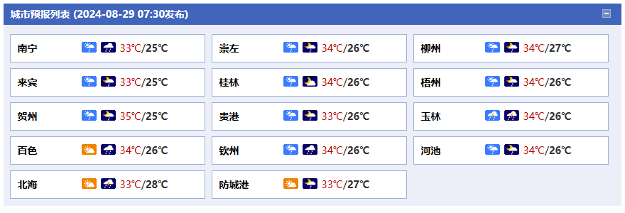 30日白天到晚上,桂西部分地區(qū)有小到中雨、局地大雨到暴雨并伴有短時(shí)雷暴大風(fēng)等強(qiáng)對(duì)流天氣,其它地區(qū)多云有分散陣雨或雷雨、局地大雨。最高氣溫:全區(qū)大部30~35℃。