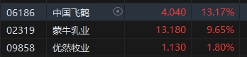 乳制品股全天高漲,中國飛鶴漲超13%,蒙牛乳業(yè)漲超9%。中國飛鶴上半年收益100.95億元,按年增加3.7%;毛利68.53億元,上升7.8%。錄得純利18.75億元,增長10.6%;蒙牛乳業(yè)上半年收入446.71億元,同比下跌12.61%;毛利率提升1.9個百分點至40.3%;盈利24.46億元,同比減少19.03%,并宣布股份回購計劃。計劃于未來十二個月內(nèi)根據(jù)市場情況進行最高達20億港元的股份回購。
