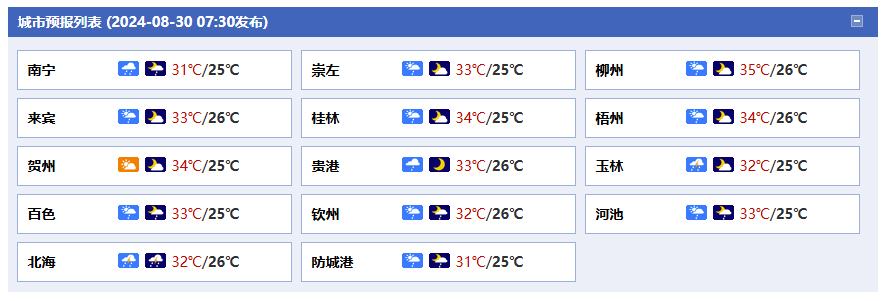 31日白天到9月1日晚上,桂南、桂西有陣雨或雷雨、局地大雨并伴有短時雷暴大風等強對流天氣,其它地區(qū)多云有分散陣雨或雷雨。