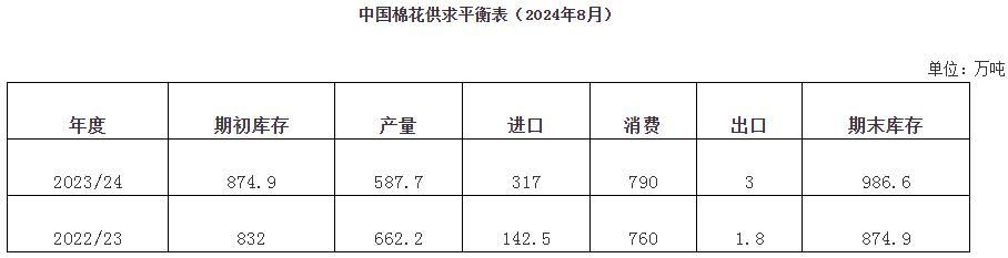 7月,國(guó)內(nèi)棉花市場(chǎng)供應(yīng)寬松,政策相對(duì)穩(wěn)定,國(guó)家發(fā)放棉花進(jìn)口滑準(zhǔn)稅配額數(shù)量20萬(wàn)噸,外棉進(jìn)口大幅增量;紡織行業(yè)運(yùn)行持續(xù)平淡,純棉類產(chǎn)品銷售遲緩,受棉價(jià)下跌影響,企業(yè)采購(gòu)棉花持謹(jǐn)慎態(tài)度,現(xiàn)貨成交偏弱。中國(guó)棉花協(xié)會(huì)預(yù)測(cè):2023/24年度,全國(guó)棉花產(chǎn)量587.7萬(wàn)噸,同比下降11.3%;棉花進(jìn)口量317萬(wàn)噸,同比增長(zhǎng)1.2倍;消費(fèi)量790萬(wàn)噸,同比增長(zhǎng)4%;期末庫(kù)存986.6萬(wàn)噸,同比增長(zhǎng)12.8%。7月,全國(guó)大部棉花處于開花期,新疆局部地區(qū)進(jìn)入裂鈴?fù)滦跗?,氣候條件總體適宜,單產(chǎn)有望再創(chuàng)新高,中國(guó)棉花協(xié)會(huì)預(yù)測(cè):2024/25年度棉花總產(chǎn)量約為605噸,同比增長(zhǎng)3%。
