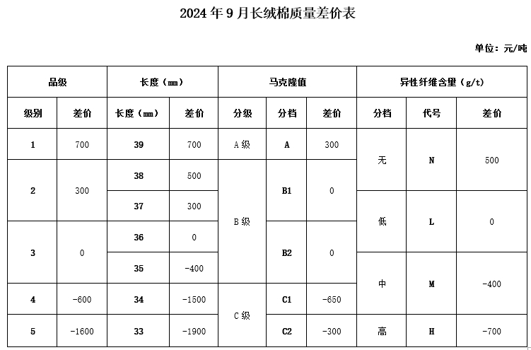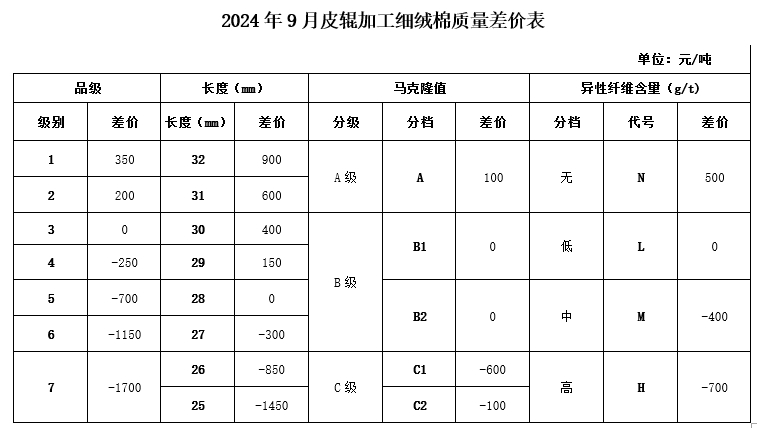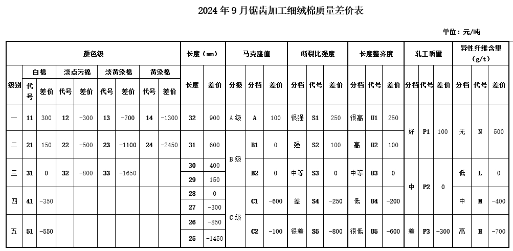 根據(jù)《中國(guó)棉花協(xié)會(huì)國(guó)產(chǎn)棉質(zhì)量差價(jià)表管理辦法》規(guī)定,現(xiàn)正式發(fā)布2024年9月《鋸齒加工細(xì)絨棉質(zhì)量差價(jià)表》、《皮輥加工細(xì)絨棉質(zhì)量差價(jià)表》和《長(zhǎng)絨棉質(zhì)量差價(jià)表》(單位:元/噸)。
