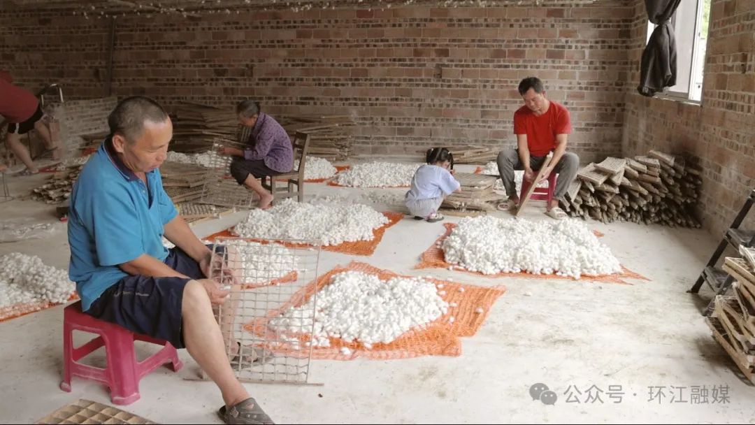 眼下正值初秋時(shí)節(jié),環(huán)江各鄉(xiāng)鎮(zhèn)迎來(lái)了秋季第一批蠶繭豐收上市,蠶農(nóng)們忙碌著摘繭、賣(mài)繭。近日,在大才鄉(xiāng)新坡村蠶桑養(yǎng)殖戶韋建波的蠶房?jī)?nèi),一排排方格簇整齊排列,大蠶均已上簇結(jié)繭,雪白蠶繭滿滿當(dāng)當(dāng),甚是喜人。一家人正忙著采收蠶繭,臉上洋溢著豐收的喜悅。