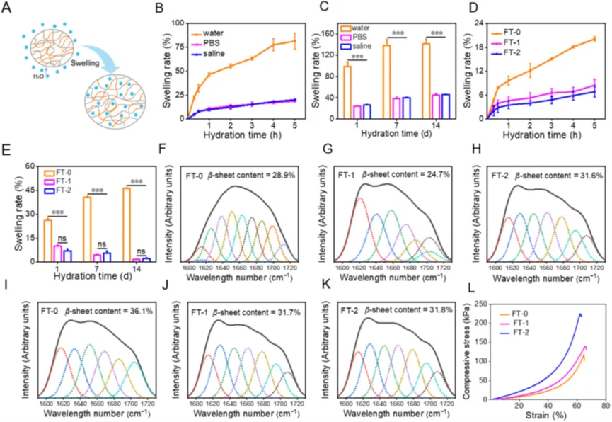 圖3 (A)水凝膠的溶脹示意圖。(B-C) FT-0在不同溶液中0-5 h和1-14天的溶脹率。(D、E) FT-0、FT-1、FT-2在生理鹽水中0 ~ 5 h、1 ~ 14 D溶脹率。(F-H) FT-0、FT-1和FT-2在生理鹽水中1個月后的FTIR光譜。(I-K) FT-0、FT-1和FT-2在生理鹽水中2個月后的FTIR光譜。(L)溶脹FT-0、FT-1和FT-2的壓縮應(yīng)變-應(yīng)力曲線。
