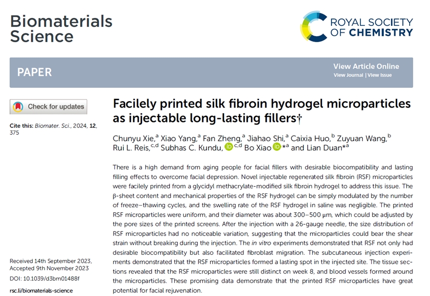 老年人對具有良好生物相容性和持久性的面部填充劑有很高的需求,以克服面部凹陷。采用甲基丙烯酸縮水甘油酯修飾的絲素水凝膠打印新型可注射再生絲素(RSF)微粒來解決這個問題。RSF水凝膠的β-片含量和力學性能可以通過凍融循環(huán)次數(shù)進行調(diào)節(jié),RSF水凝膠在鹽水中的溶脹率可以忽略不計。打印的RSF微粒均勻,直徑約為300-500 μm,可以通過打印屏幕的孔徑進行調(diào)節(jié)。用26號針注射后,RSF微粒的尺寸分布沒有明顯變化,說明微顆粒在注射過程中能夠承受剪切應(yīng)變而不破裂。體外實驗表明,RSF不僅具有良好的生物相容性,而且有利于成纖維細胞的遷移。皮下注射實驗表明,RSF微粒在注射部位形成持久的隆起。組織切片顯示,第8周RSF微粒仍然明顯,微粒周圍形成血管。這些數(shù)據(jù)表明,打印的RSF微粒在面部年輕化方面具有巨大的潛力。