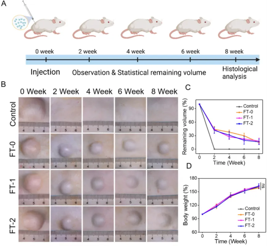 將RSF水凝膠微粒(300 mg)分散于0.3%透明質(zhì)酸溶液(1 mL)中,皮下注射大鼠背部。0.3%玻尿酸的大鼠設(shè)為對照組。用數(shù)碼相機記錄注射部位,并在預(yù)定時間點(2、4、6、8周)獲得大鼠體重。如圖6B所示,各組大鼠在注射后立即形成直徑為20 mm的隆起。值得注意的是,對照組的隆起在2周后完全消失。而FT-0、FT-1和FT-2組的隆起仍然明顯,大小減小到10 mm左右。當時間延長到4、6和8周時,F(xiàn)T-0、FT-1和FT-2組的斑點僅略有縮小。圖6C中相應(yīng)的隆起體積半量化也表現(xiàn)出類似的趨勢。