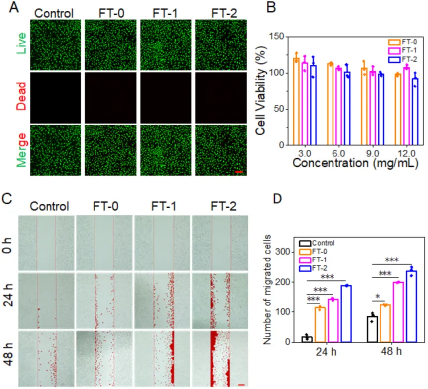 采用活/死染色和MTT法檢測RSF水凝膠微粒的細胞毒性。如圖5A所示,L929細胞以綠色熒光(活細胞)為主,幾乎沒有觀察到代表死細胞的紅色熒光,說明共孵育不會導致L929細胞死亡。圖5B為孵育24 h后的細胞活力。當RSF水凝膠微粒濃度低于9 mg/mL時,細胞活力大于80%?;?死染色數(shù)據(jù)和MTT試驗確定所有RSF水凝膠微顆粒具有理想的生物相容性。抓痕實驗來驗證RSF水凝膠微粒促進L929的遷移。圖5C顯示,F(xiàn)T-0、FT-1和FT-2在24 h和48 h都顯著地刺激了L929向劃痕區(qū)域的遷移。這些數(shù)據(jù)表明,RSF水凝膠微??赡艽龠M成纖維細胞向注射部位遷移,從而有利于膠原纖維的沉積。